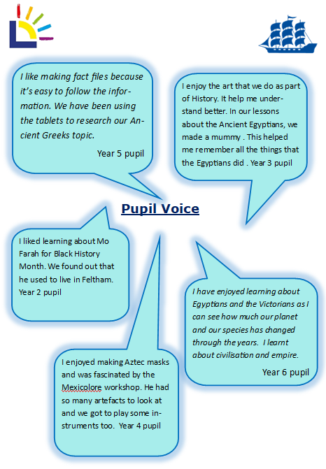 In History lessons, pupils are encouraged to ask questions, think critically, make use of a range of evidence and artefacts, and reflect and discuss with increasing depth. Pupils learn how events from the past impact on modern-day life, with British values threaded throughout our units of study. Cross curricular links with texts used in English and other subjects including Music, Art, DT and PE, help to enrich our children’s learning experiences and ensure that History is an engaging and accessible area of study for all our pupils. Alongside this, we celebrate and deepen our understanding of history through themed days and invite a range of visitors to the school, who further enrich our children’s learning through presentations, re-enactments, and first-hand reports about life in the past.
